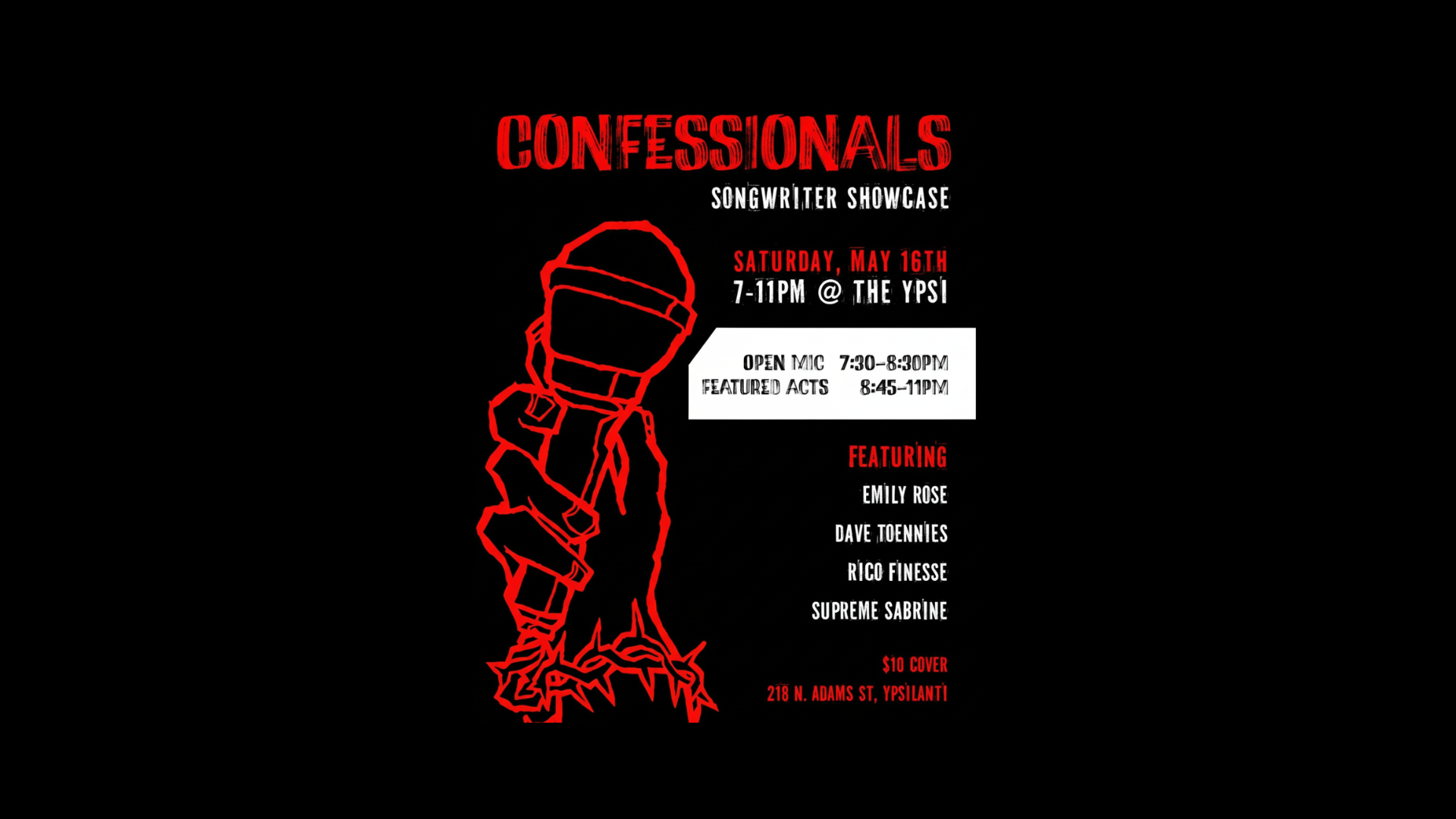 Confessionals is an all-ages songwriter showcase in Ypsilanti, Michigan to showcase songwriters and give new voices a chance to perform for an engaged, supportive audience. There will be a lineup of featured performers, as well as an open mic time that folks can sign up for in advance and at the event.